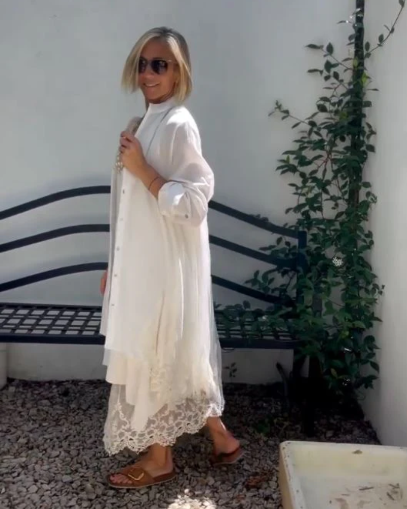 Layered beneath is a stunning white lace dress with a delicate, intricately patterned sheer lace hem that adds a touch of romantic allure.