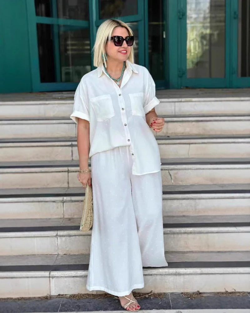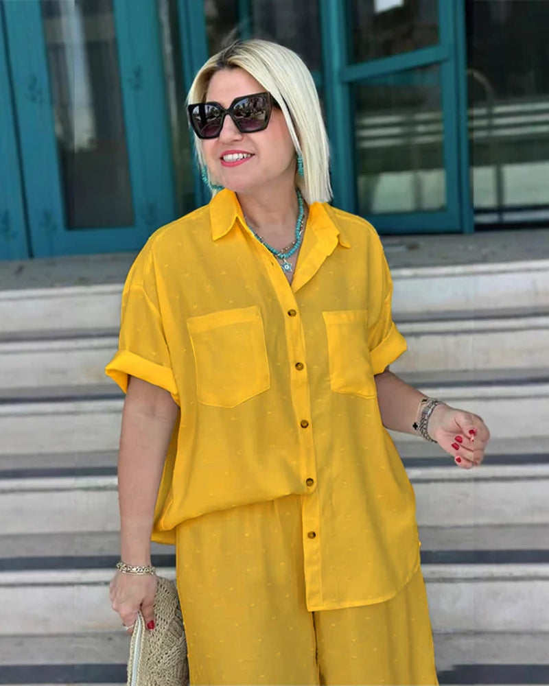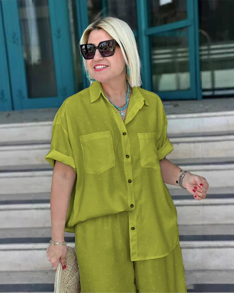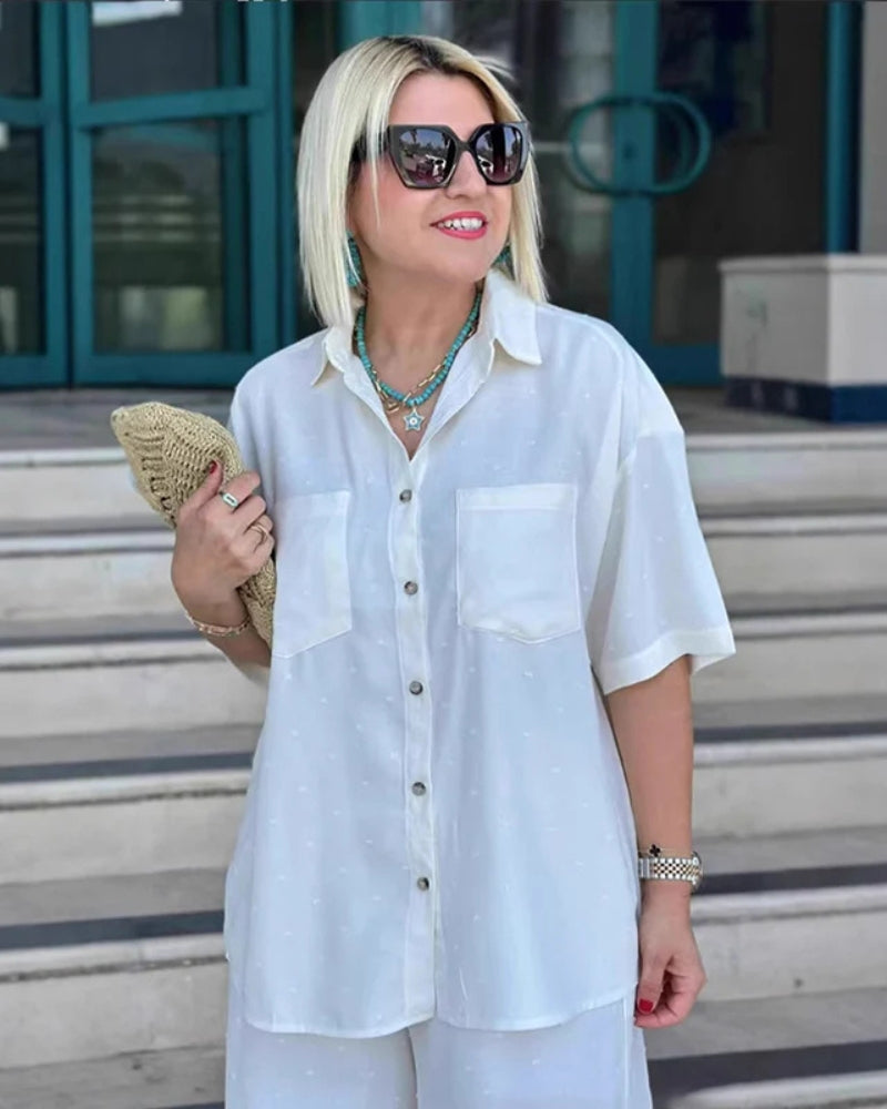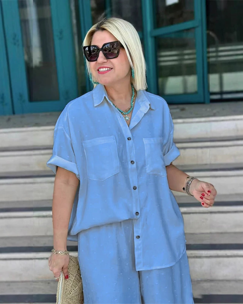 This set features a loose-fitting, short-sleeve button-down shirt with practical chest pockets and a classic collar, paired with comfortable wide-leg cropped trousers that boast a relaxed drawstring waist.