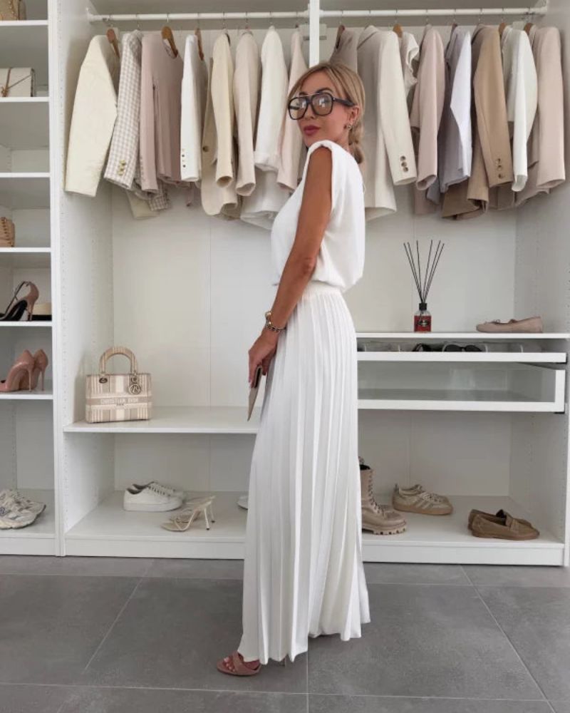 A stylish set featuring a round-neck blouse, perfect for a relaxed and effortless look.