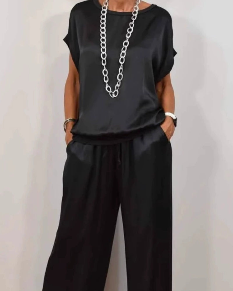 - This set, consisting of a loose-fitting blouse and wide-legged pants, offers many styling possibilities.