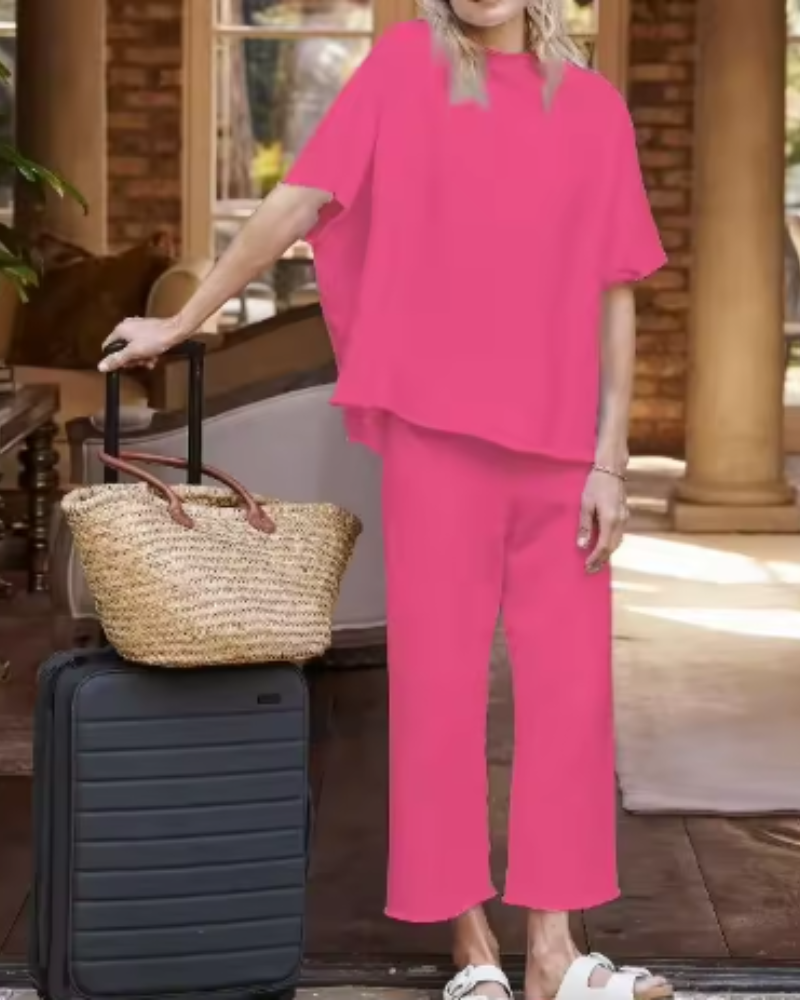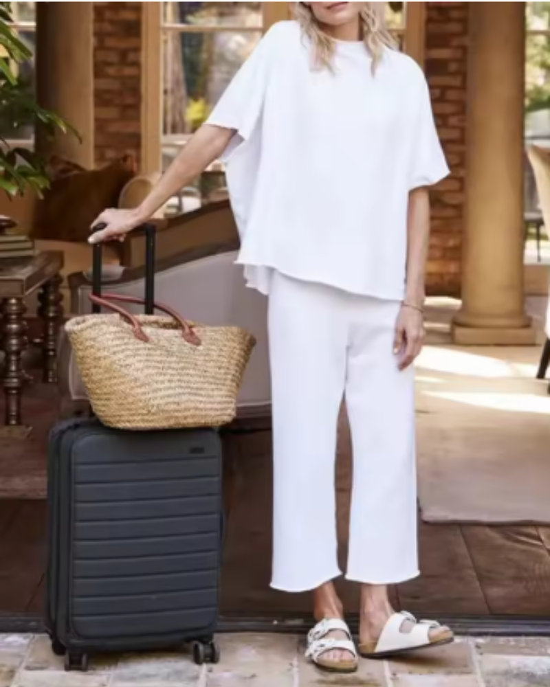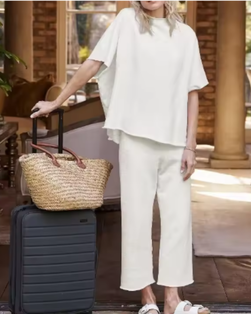 This two-piece ensemble features a loose, flowing top and matching wide-leg pants in a soft neutral hue – ideal for travel, lounging, or casual outings.