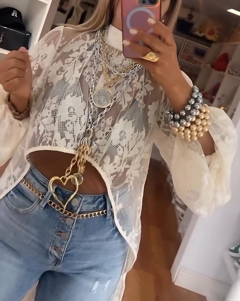 Featuring a romantic mock neck, voluminous balloon sleeves, and a flowy high-low hem.