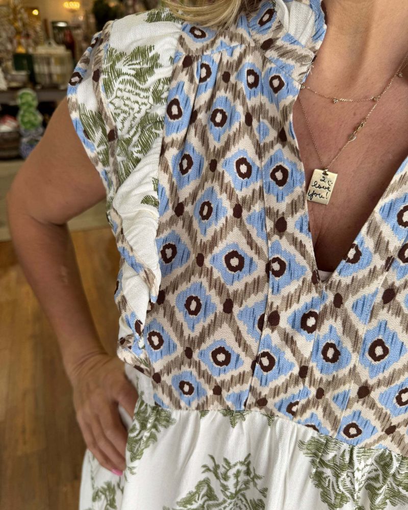 Featuring delicate adjustable shoulder ties with tassel details, a relaxed A-line fit, and an enchanting mix of earthy tones and vibrant pops of color.