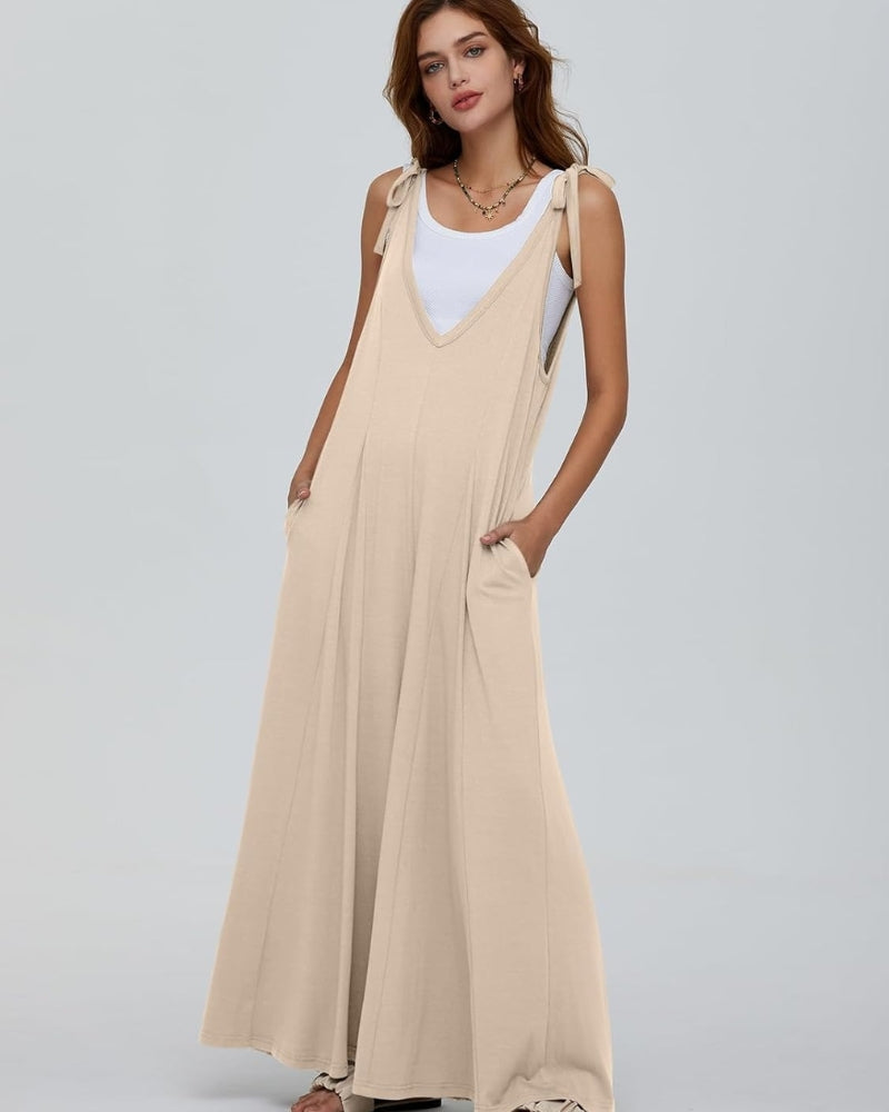 Featuring a free-flowing wide-leg silhouette, soft fabric, and charming tie-shoulder straps, this jumpsuit brings together comfort and bohemian flair.